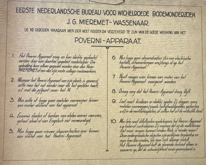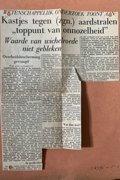 Een zijdelings crimineel linkje vond ik trouwens wel. Mijn wichelroedeloper haalde in 1961 voor de zoveelste keer de krant. Dit keer omdat er een kluis uit zijn woning was gestolen met onder meer de bouwtekeningen van zijn aardstralenkastjes erin. Deze gebeurtenis reikte me een moment aan waarop mijn hoofdpersoon zijn leven en werk onder de loep kon (misschien wel: moest) nemen. De af en toe opduikende twijfel of ik zonder sprekende bronnen tot een boek zou kunnen komen zakte weg en zoals dat gaat, vond ik ze toen ineens vanzelf.