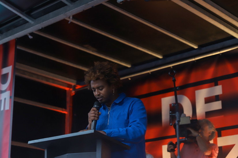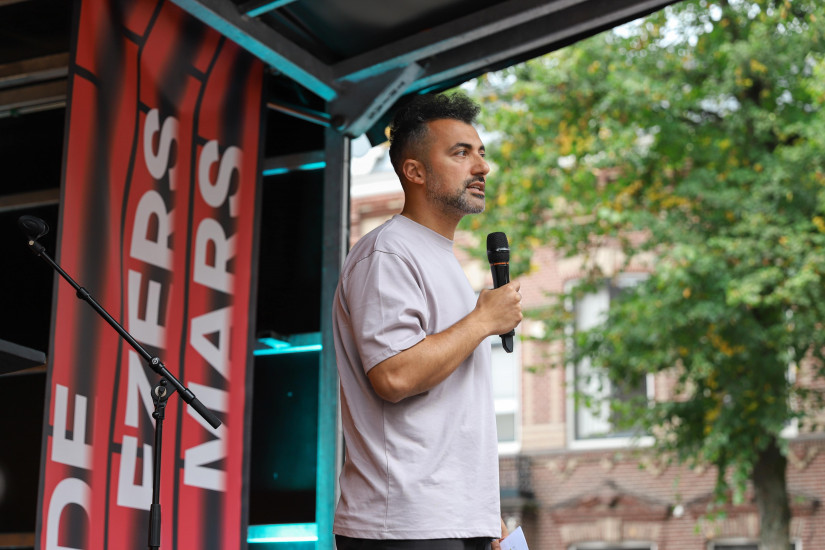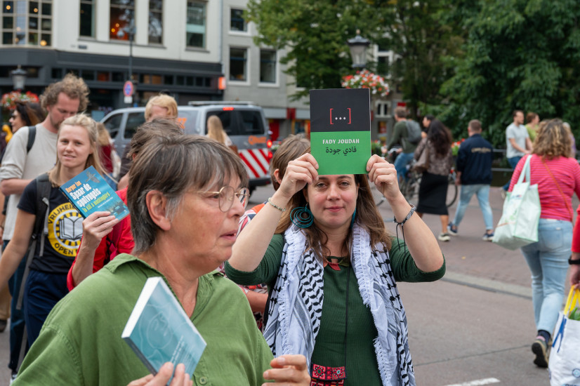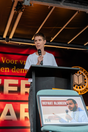 De mars eindigde op het Domplein met toespraken. Özcan Akyol vertelde in zijn welkomstwoord dat sommige van zijn collega-schrijvers vanwege intimidatie niet meer durven te schrijven wat ze willen. Eke Krijnen stond stil bij het leven, werk en de dood van Palestijnse schrijver en dichter Refaat Alareer die in 2023 is gedood door een Israëlische aanval. Jessica van Geel legt uit waarom niets doen geen optie meer is.